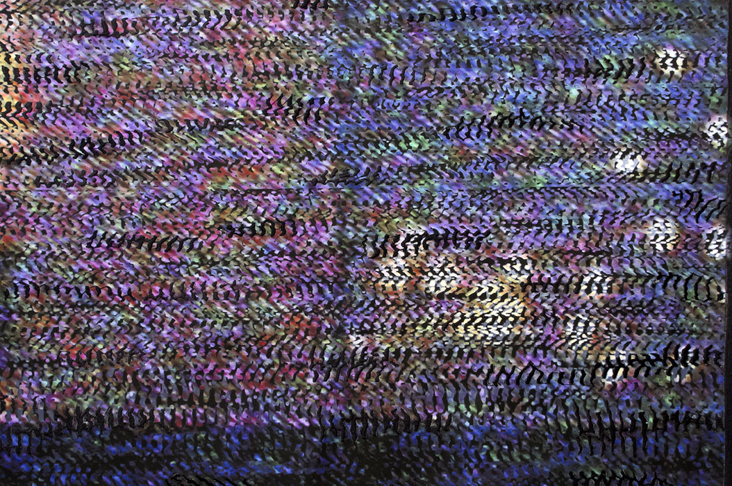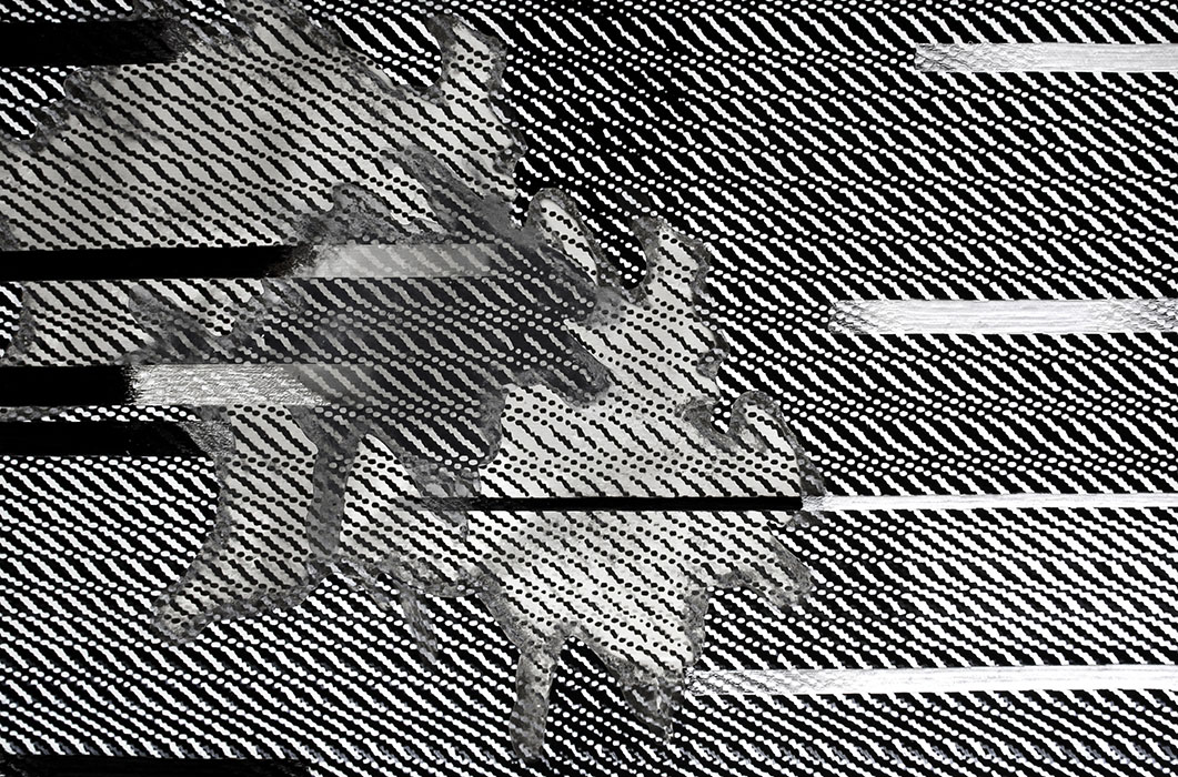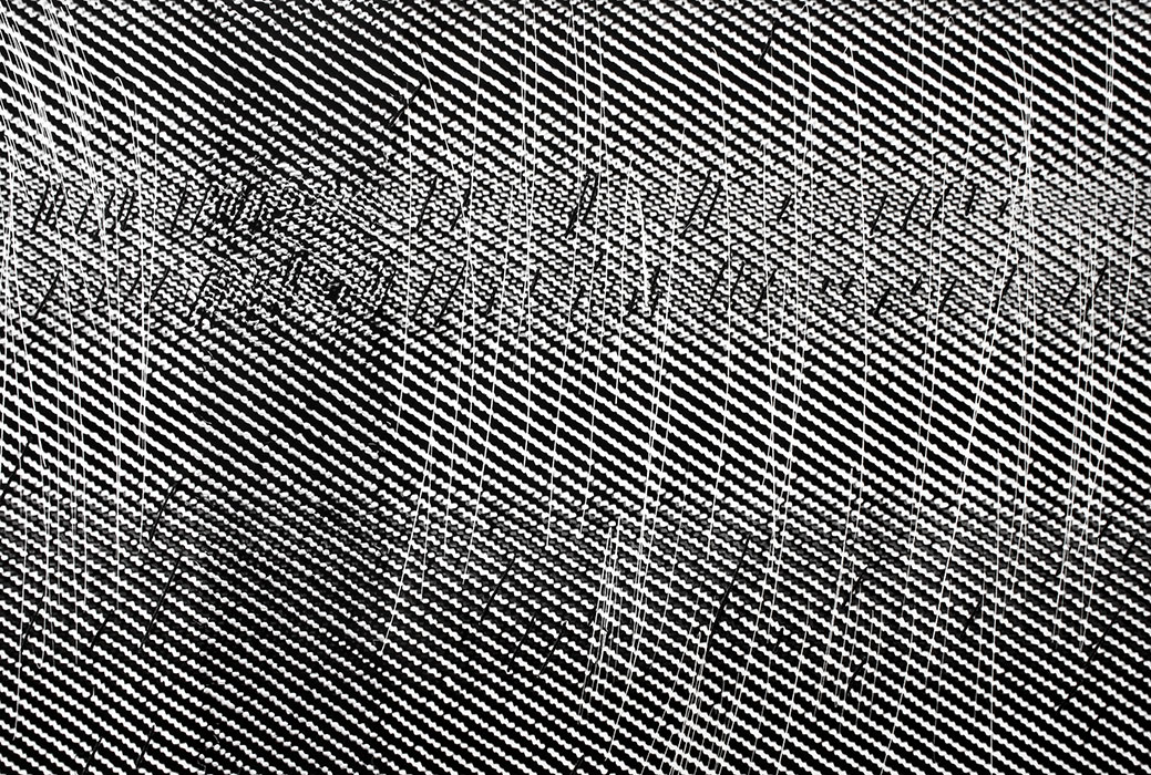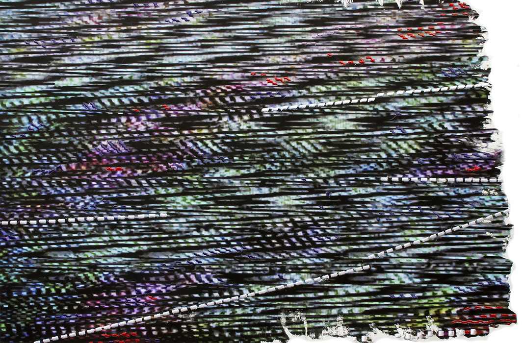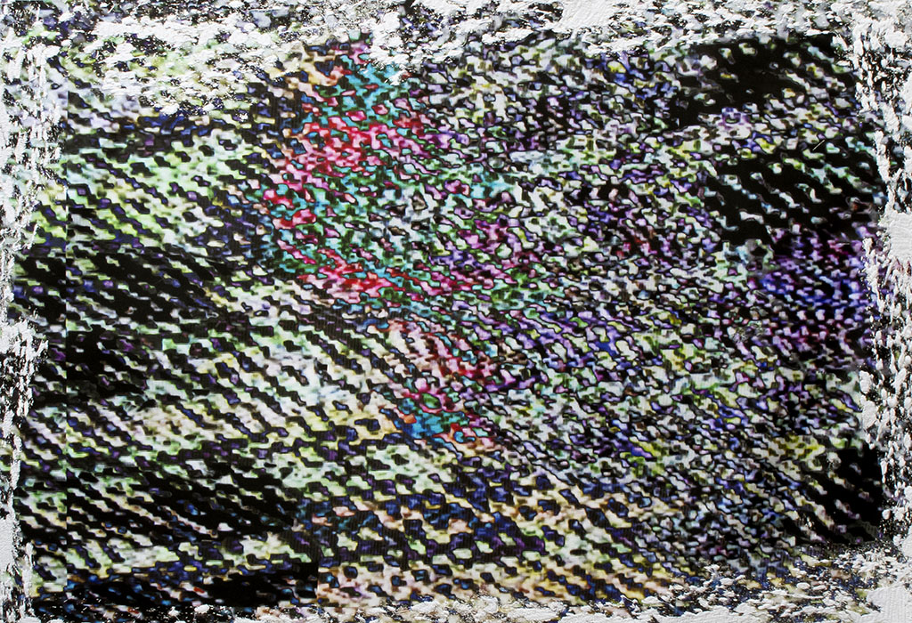 1- Bordados Electrónicos piezas que nacen de la imagen electrónica de los televisores, capturas de frames que luego son bordadas industrialmente por la autora creando una nueva unión entre el tacto analógico y la inmaterialidad digital. Abstracciones que se relacionan con la obra de Nan June Paik.